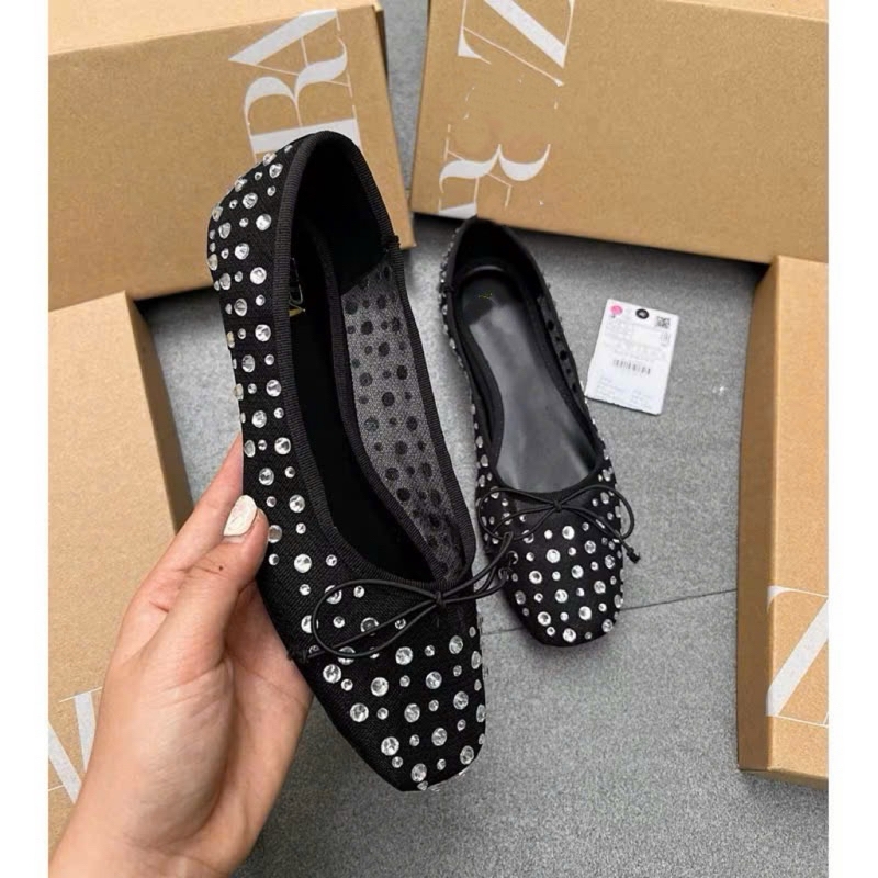 Giày bệt Da lộn đen dây ngang đính cườm hoa Fullbox/8330-12T1.4-H481